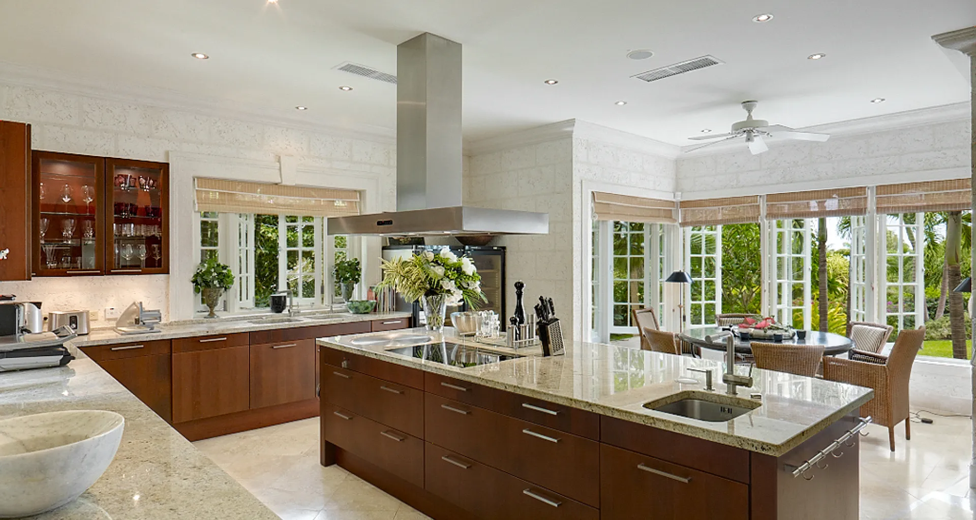 The home’s airy interiors flow effortlessly between indoor and outdoor spaces, highlighting finely detailed woodwork, vaulted ceilings, and natural stone finishes. Every element of its construction was thoughtfully executed to create a timeless residence that balances refined elegance with a relaxed island sensibility.