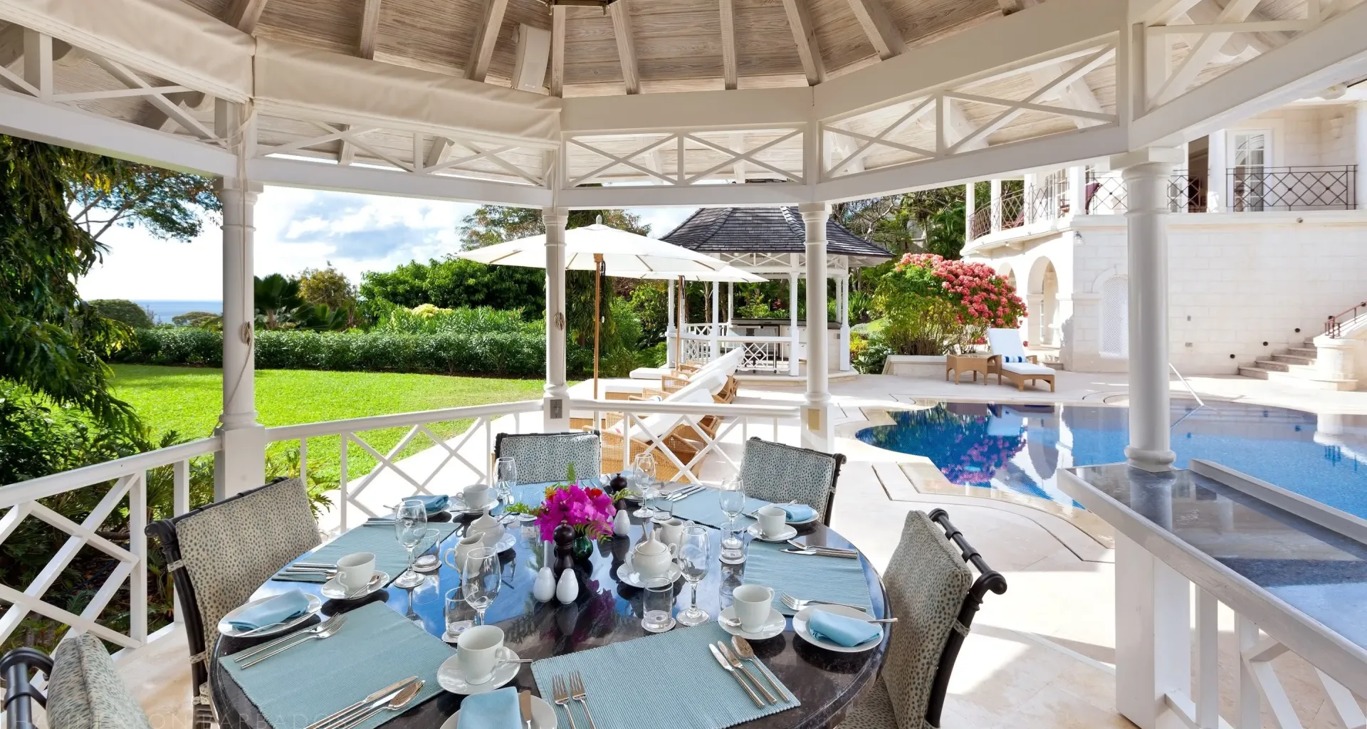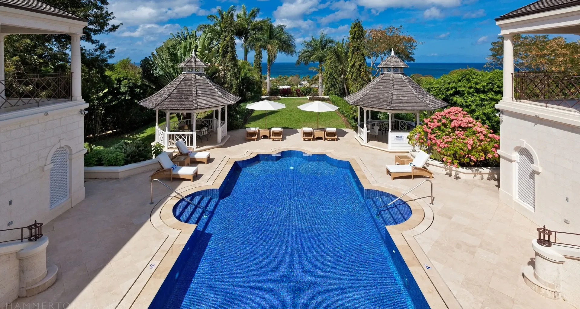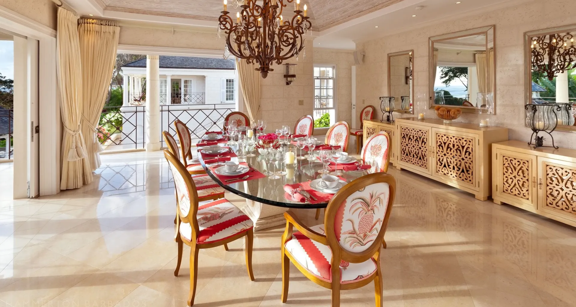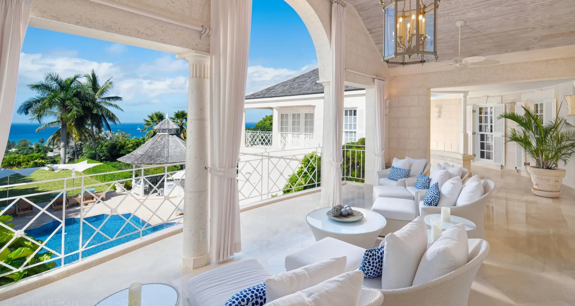 The architecture integrates indoor and outdoor living seamlessly through French doors, covered galleries, and garden pavilions. High ceilings, hand-finished plasterwork, and marble flooring highlight the craftsmanship and structural precision throughout. Thoughtful orientation captures ocean views and natural light, while refined detailing anchors the residence in timeless Caribbean elegance.