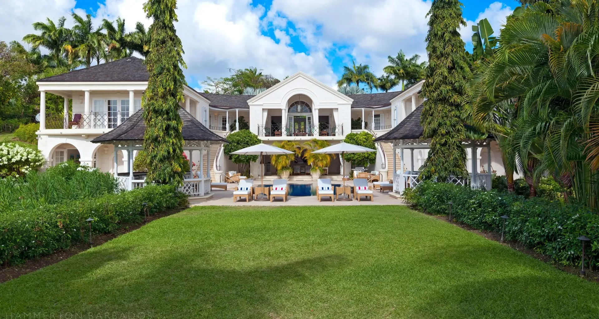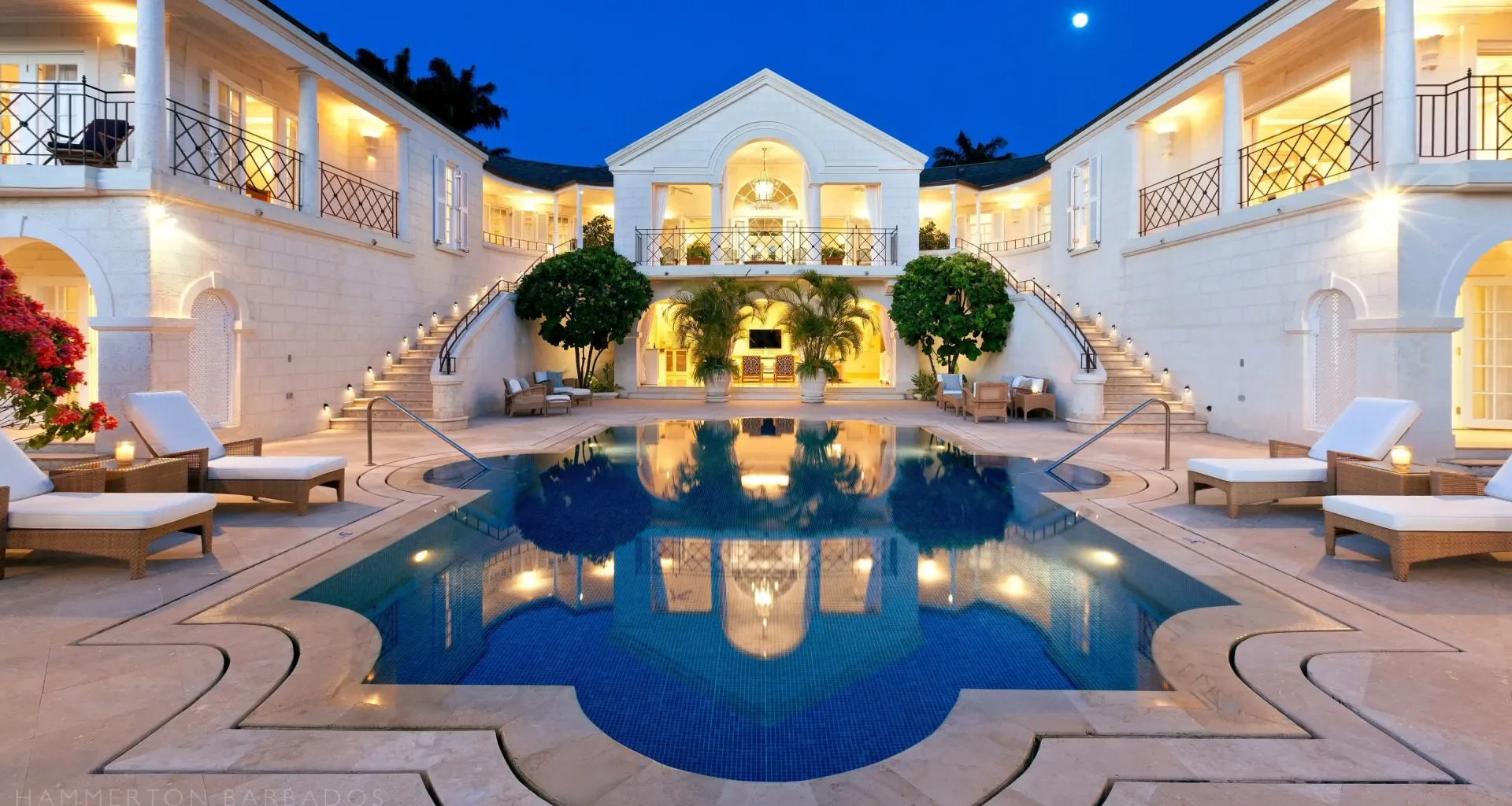 Completed in 2008, Illusions is a grand estate designed around a strong axial layout and symmetrical classical façade. Constructed in traditional coral stone, the home features twin staircases framing a central pool terrace, formal pediments, and arched verandas that emphasize proportion and balance.