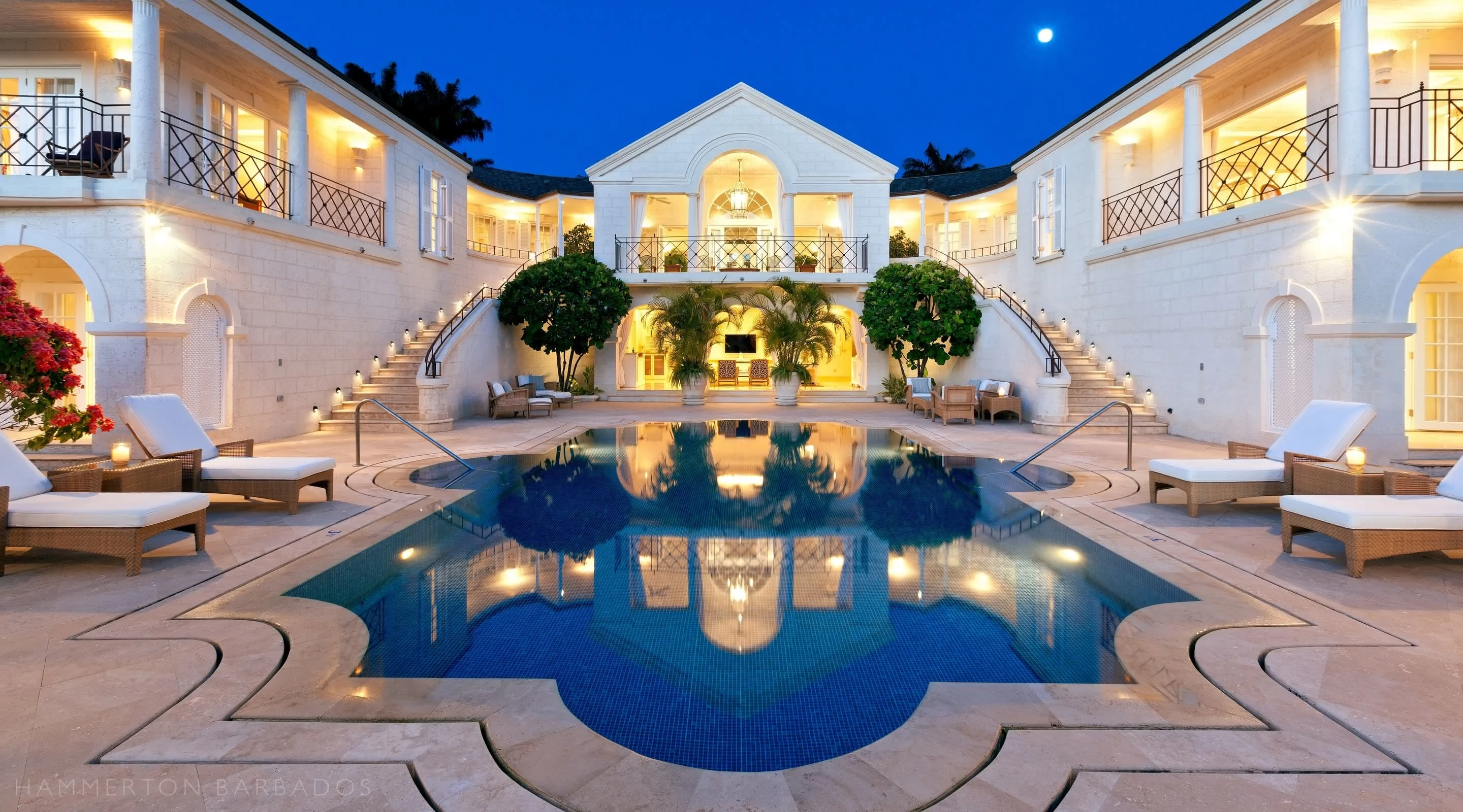 Completed in 2008, Illusions is a grand estate designed around a strong axial layout and symmetrical classical façade. Constructed in traditional coral stone, the home features twin staircases framing a central pool terrace, formal pediments, and arched verandas that emphasize proportion and balance.