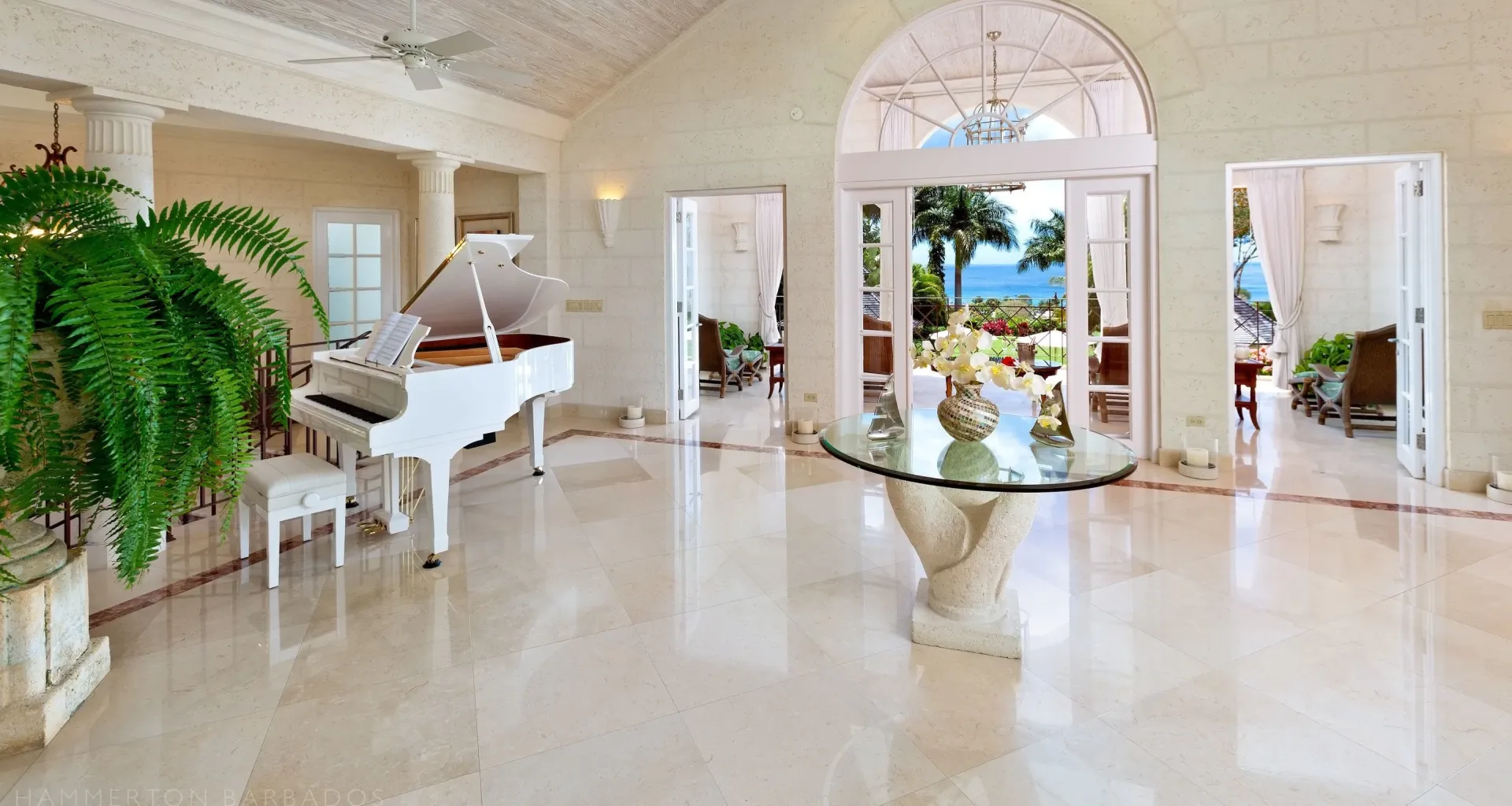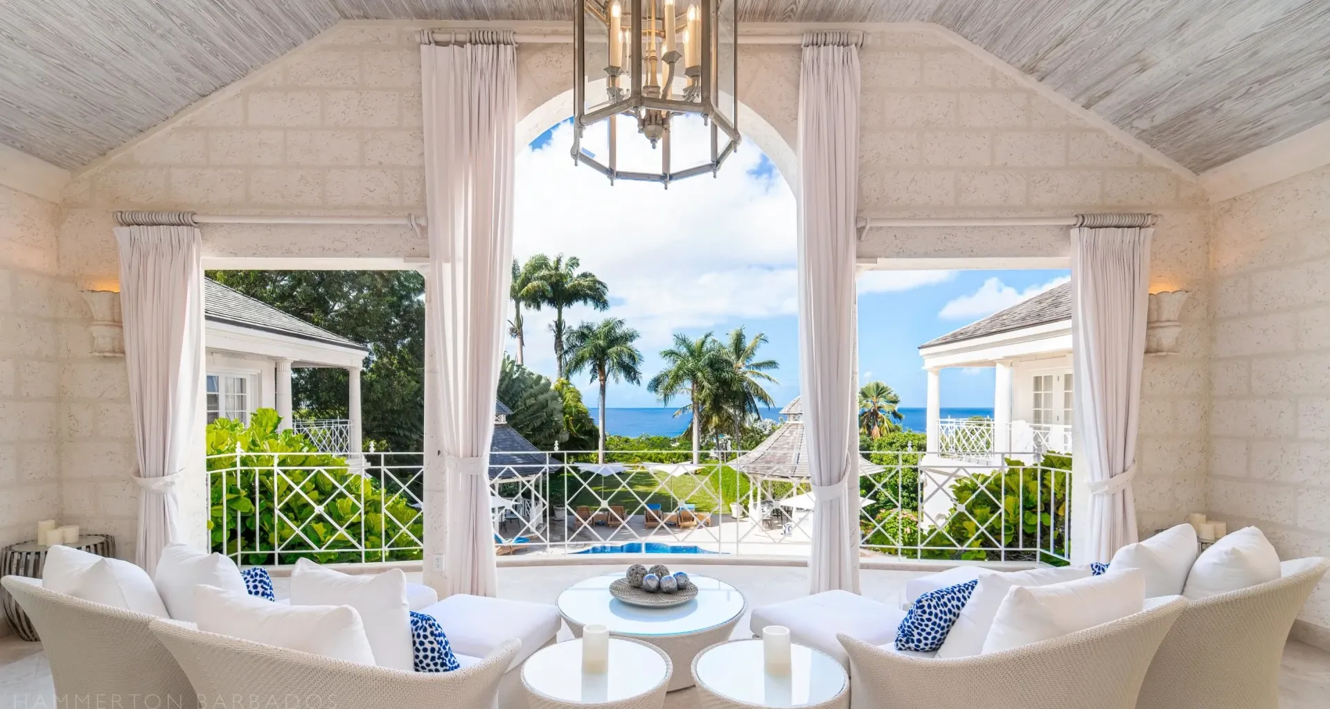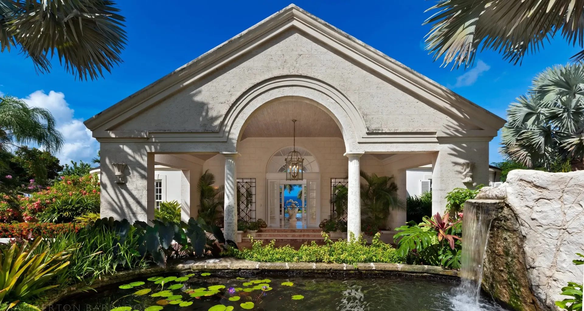 The architecture integrates indoor and outdoor living seamlessly through French doors, covered galleries, and garden pavilions. High ceilings, hand-finished plasterwork, and marble flooring highlight the craftsmanship and structural precision throughout. Thoughtful orientation captures ocean views and natural light, while refined detailing anchors the residence in timeless Caribbean elegance.