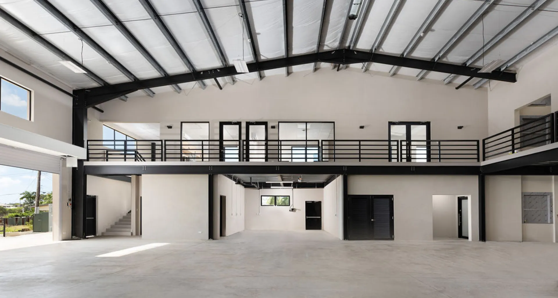 The building features a spacious industrial-grade warehouse with a double-height steel structure, engineered for efficiency and durability. Above, a sleek mezzanine office floor offers clean lines, abundant natural light, and an open-concept layout that supports collaboration and operational flow.